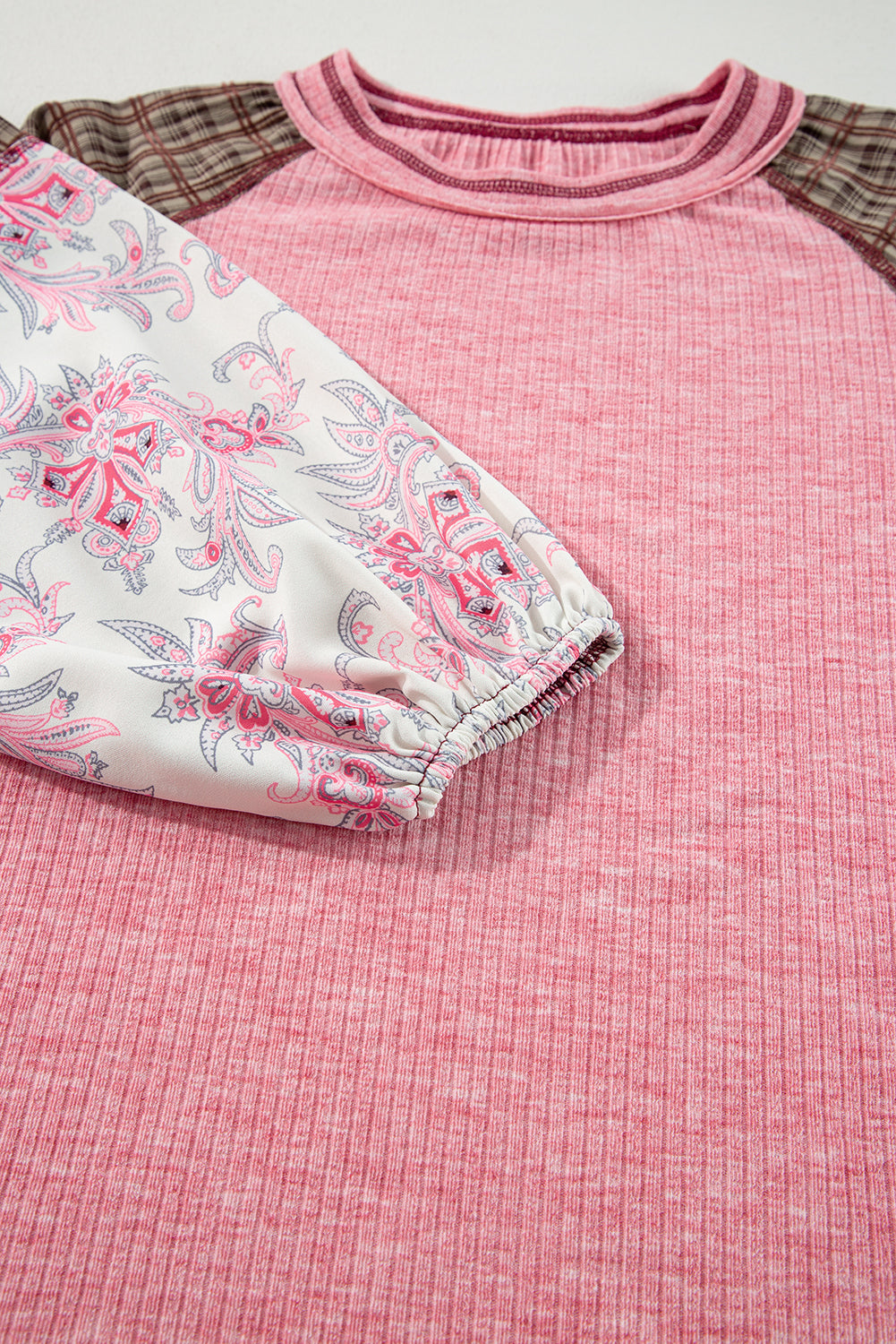 Plaid Floral Patchwork Round Neck Long Sleeve Top